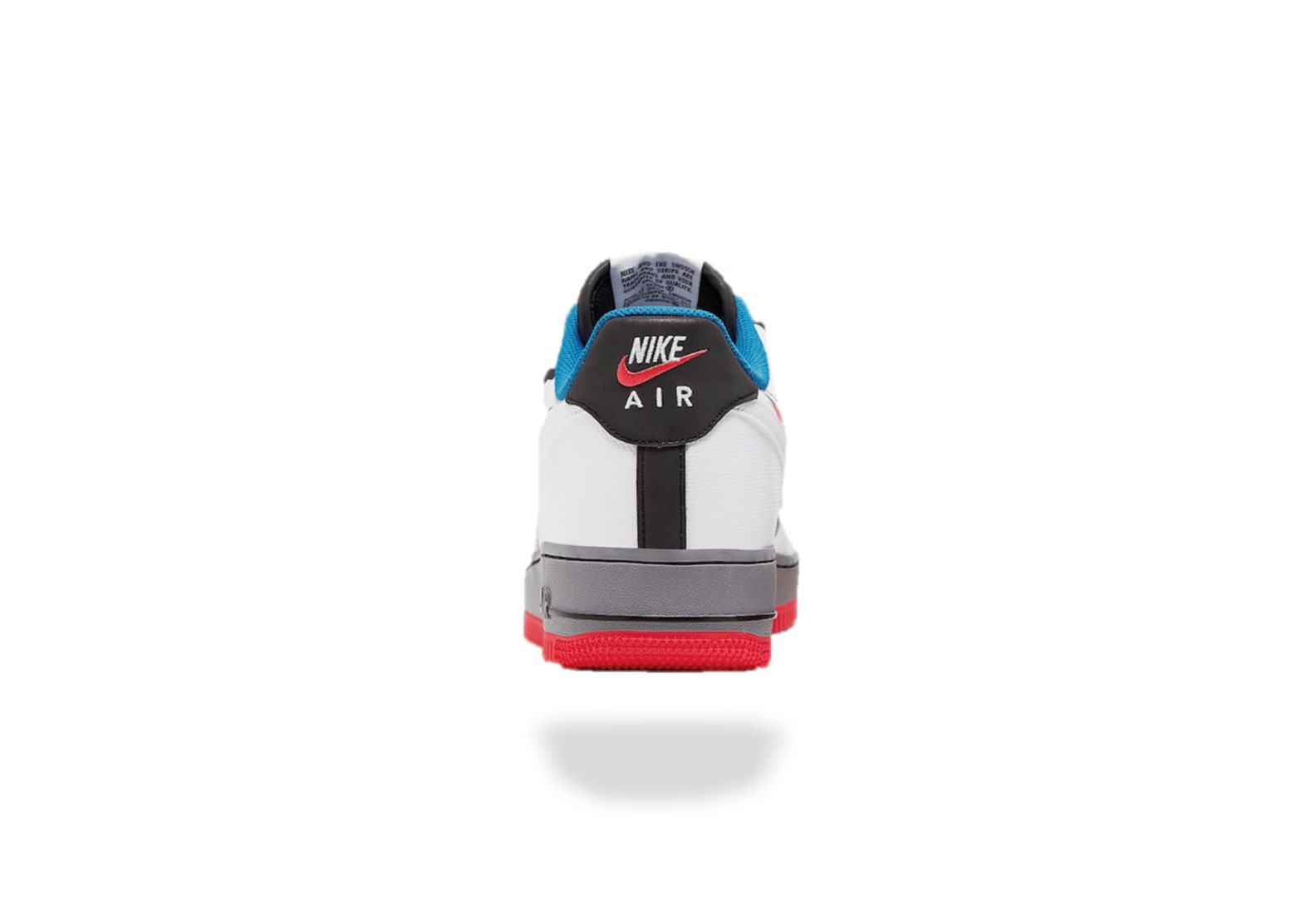Issue de la collection Logo Sketch qui célèbre la naissance du célèbre Swoosh, cette seconde AIR FORCE 1 LOW SCRIPT SWOOSH WHITE BLUE bénéficie d’une empeigne blanche, élaborée avec un mélange de cuir et de matériaux synthétiques. On découvre également un imprimé Safari au niveau des oeillets, des lacets bicolores, ainsi qu’une languette noire. Une doublure bleue, un Script Swoosh sur le quarter panel, ainsi qu’une semelle grise combinée à une outsole rouge, finalisent le design de Bruce Kilgore.