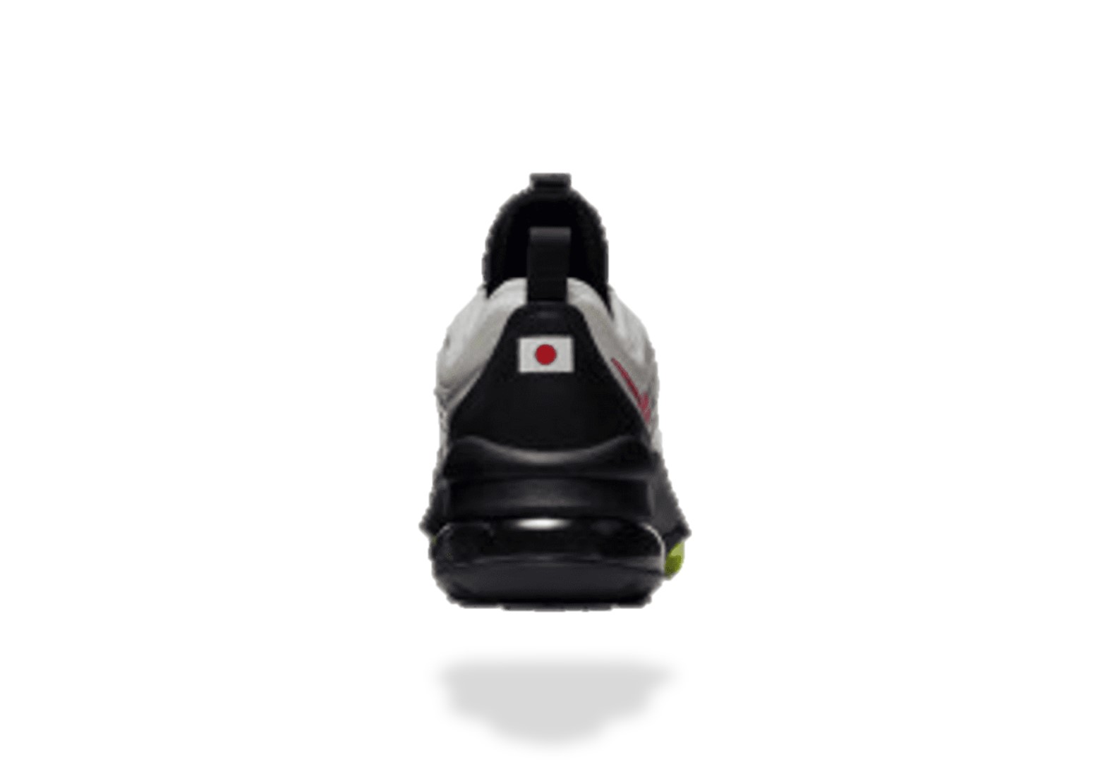 Au niveau de la palette de couleurs, sur cette AIR MAX ZOOM 950 NRG JAPAN on découvre une combinaison de plusieurs teintes grises et de jaune fluorescent qui n’est pas sans rappeler le coloris OG Neon. Les autres finitions comprennent une languette en néoprène noir, un mini swoosh rouge, le drapeau japonais sur les talons, ainsi qu’une semelle équipée de deux unités Zoom Air à l’avant et d’une unité Air-Sole provenant de la Air Max 270 à l’arrière.