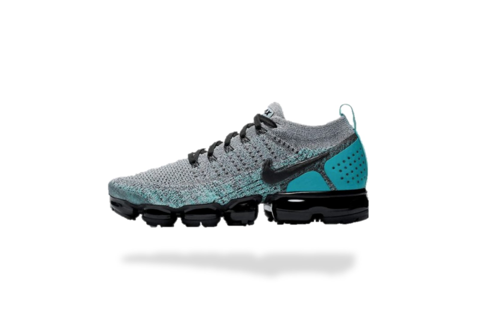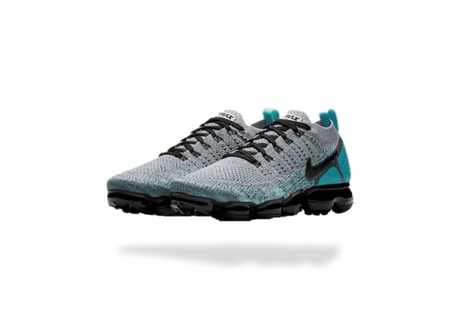 Cette version 2.0 de la Nike Air VaporMax a un revêtement en flyknit gris et turquoise, combiné à un renforcement turquoise et des accents de noir, sur les lacets, l’unité Vapormax ou le swoosh.