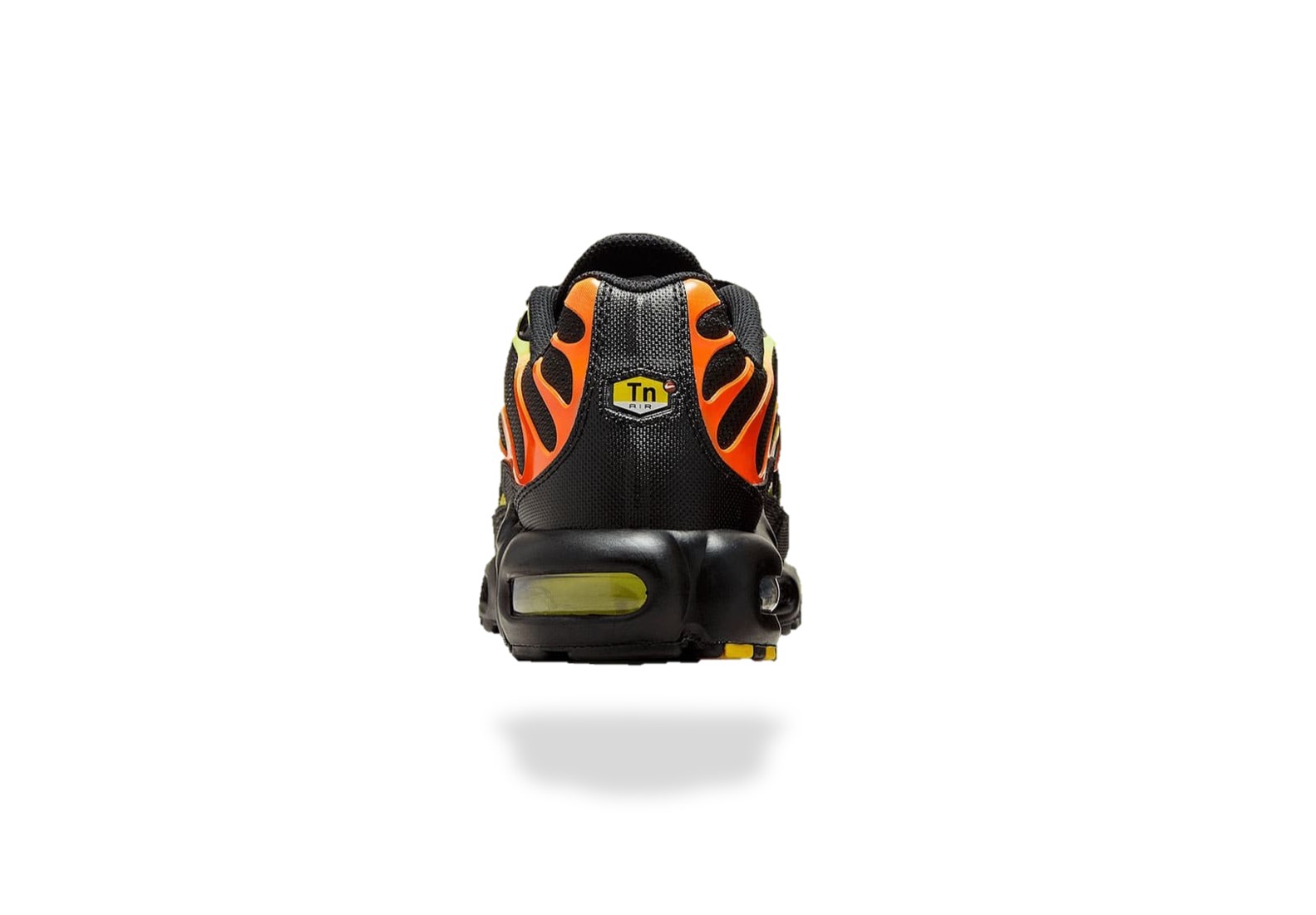 Sous le pied, les unités Tuned Air resplendissent avec une teinte volt éclatante. La midsole, quant à elle, joue la carte de la sobriété en noir, mais une fois retournée, la semelle extérieure révèle une explosion de couleurs avec des touches d’orange et de jaune qui font écho au thème incandescent de l’empeigne.