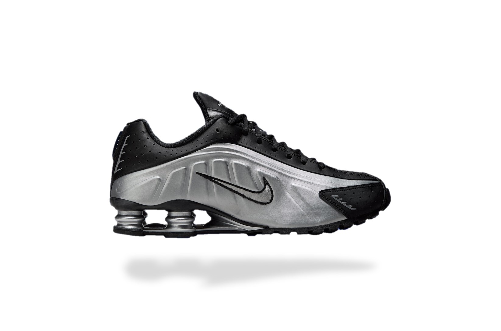 La NIKE SHOX R4 METALLIC SILVER BLACK a une tige en cuir argenté elle s’accompagne d’accents noirs, alliant style techwear et tendance rétro. Fidèle à ses origines, l’ensemble repose également sur les emblématiques colonnes Shox, pour un résultat aussi audacieux que fonctionnel.